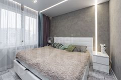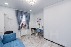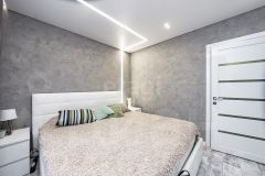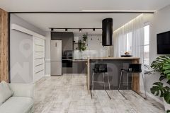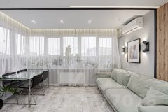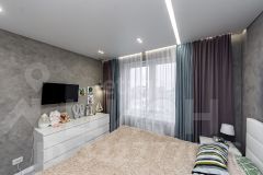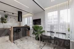 В квартире выполнен современный ремонт по дизайн-проекту, из качественных, материалов: везде уложен ламинат высокого класса, натяжные матовые потолки, со встроенными приборами освещения, на стенах обои, совмещенный санузел полностью облицован керамогранитом, унитаз - инсталляция, сейф - дверь с замком и шумоизоляцией. Очень просторная кухня - гостиная с окнами на две стены и шикарным видом из окон 16 этажа, а благодаря южной ориентации окон, в ней всегда светло и тепло.