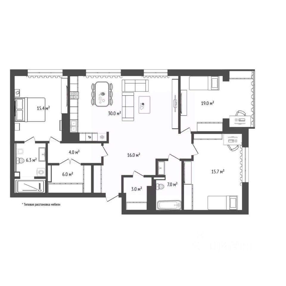 Гармоничная комфортная планировка - одно из безусловных достоинств квартиры, включает в себя просторную кухню-гостиную-столовую 30 кв.м, расположенную по центру, налево от нее расположена мастер-спальня с гардеробной и своим приватным сан.узлом, направо располагаются две просторные 16 и 19 кв.м детские, ещё один сан.узел и гардеробная.