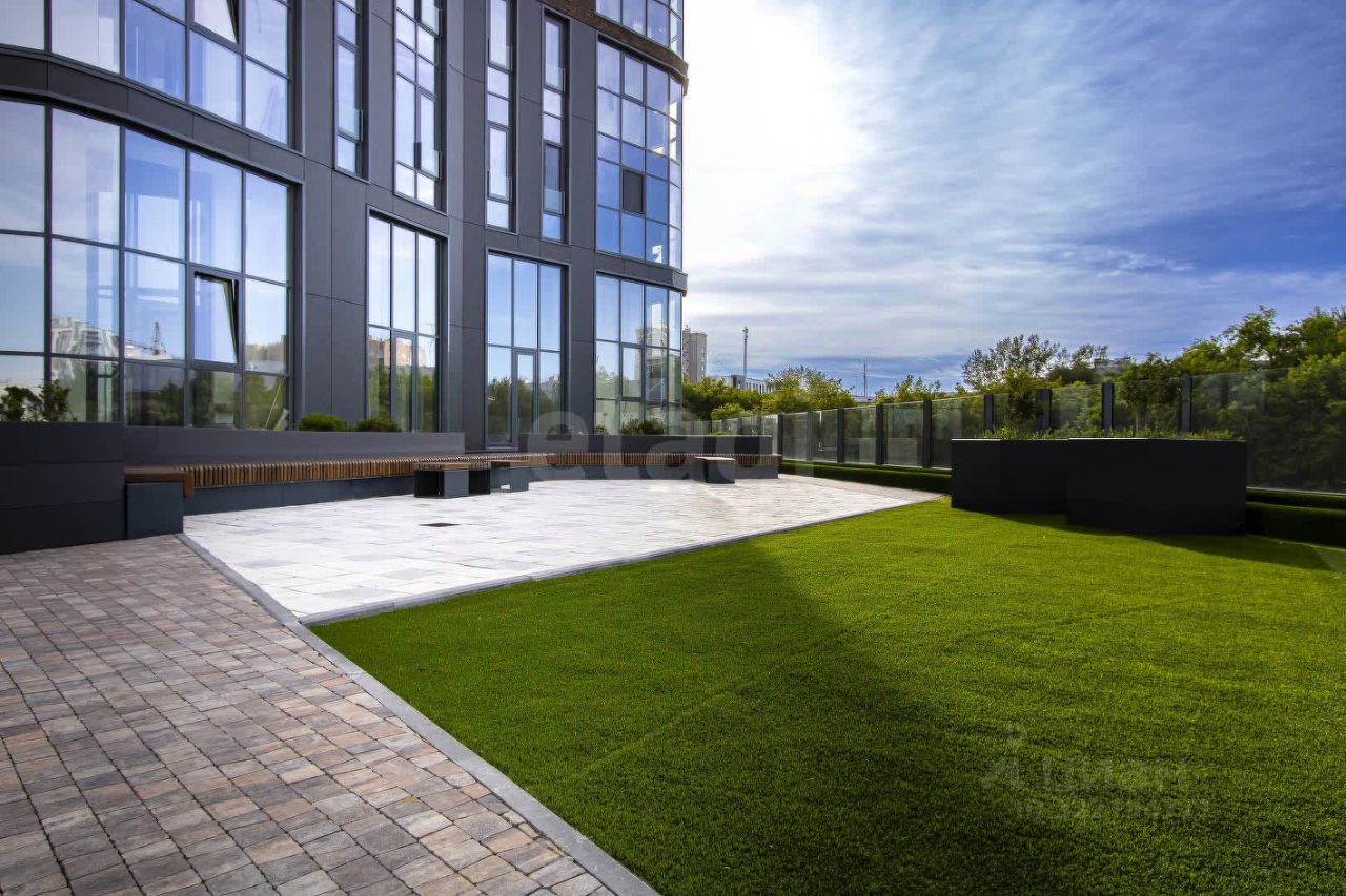 Второй и третий уровень — это "парящие дворы" на стилобате 2 этажа и на эксплуатируемой кровле 19 этажа с озеленением, местами для отдыха и занятий спортом. На первом этаже предусмотрена просторная колясочная, зона для хранения спортинвентаря, лапомойка для домашних питомцев, мягкая зона ожидания гостей, стойка ресепшн, место под кофе-поинт, комната матери и ребенка, гостевой санузел и 2 лифтовых холла.