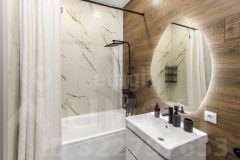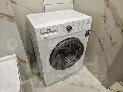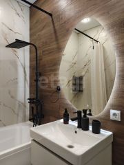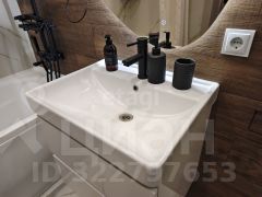 Ванна оборудованна современной сантехникой, тумбой, новой стиральной машиной.