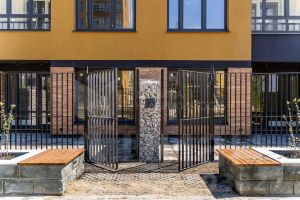 Дворовая территория оборудована интересными и безопасными детскими площадками, зонированными по возрастам. Площадки разнообразные и ко всем жители имеют доступ по ключу домофона.