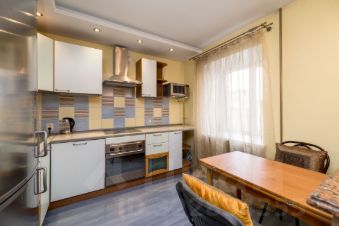 - Кухонный гарнитур с вытяжкой и встроенной стиральной машиной, которая работает значительно тише, чем обычные модели, обеспечивая комфорт даже во время стирки.