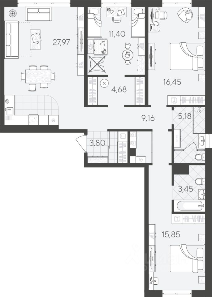 Квартира с 3 спальнями площадью 97,94 кв.м