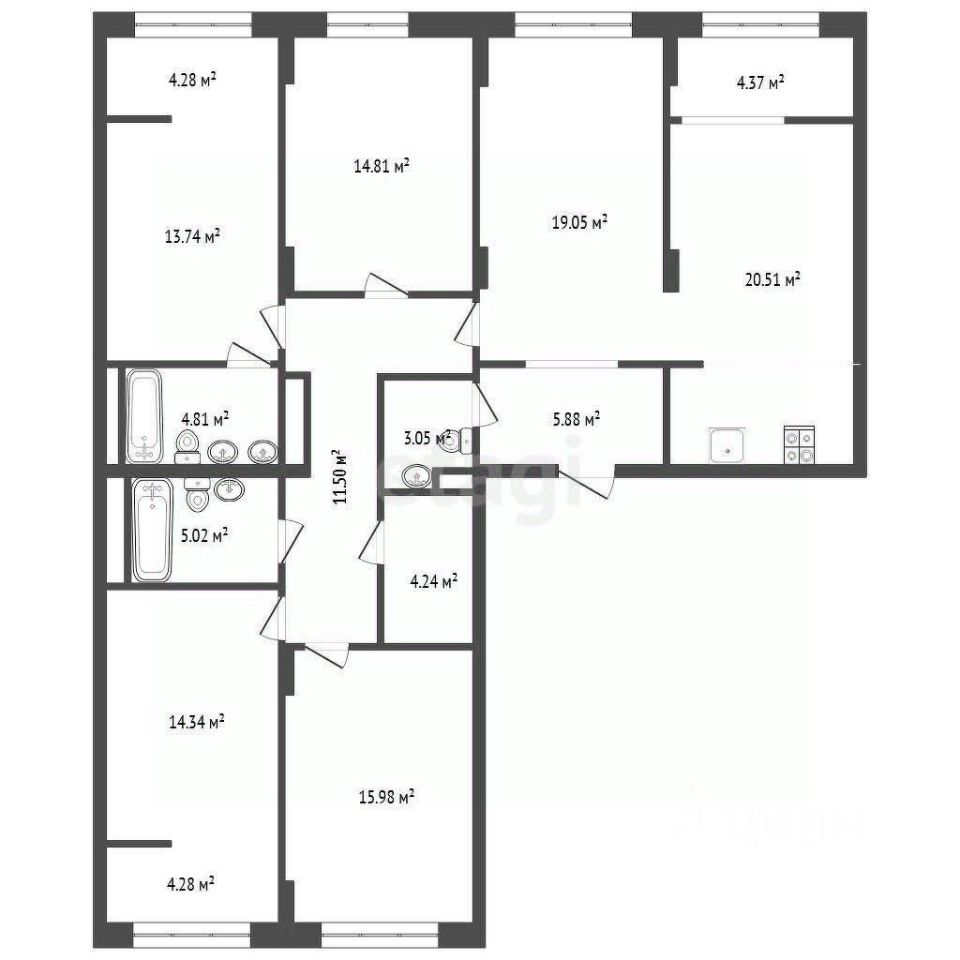 5 спален и кухня гостиная, три санузла, отдельные гардеробные комнаты, из двух спален и кухни выход на теплую лоджию.