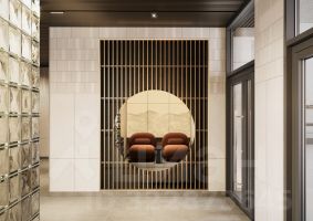 В парадных обустроен тёплый тамбур, витражи и перегородки в стиле сёдзи, мягкие зоны ожидания.