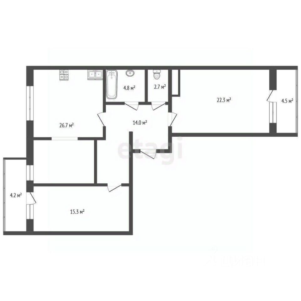 Просторная раздельная зона ванной комнаты, светлая лоджия.