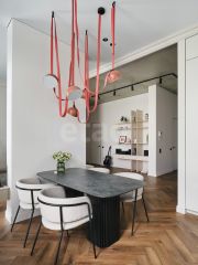 Высокие потолки - 3,4 м, все окна - в пол. Необычный ремонт - современная классика и эклектика.