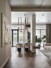 Монохромная база - светлые стены и кварц-винил "елочкой" цвета насыщенного дуба разбавлена яркими акцентами. Из двух комнат есть выход на террасу. Терраса 37 квадратов идет вдоль всей квартиры и дает сценарии жизни загородного дома: можно смотреть фильмы на проекторе, жарить еду на гриле и отдыхать с друзьями на свежем воздухе на своей территории. Жизнь на первом этаже открывает много плюсов, минусов нет.
