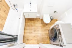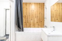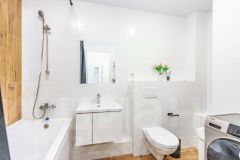 В квартире выполнен качественный ремонт: на полу ламинат 32 класса, на стенах обои под покраску позволяющие красить до 5 раз, сан узел в плитке установлена инсталляция, ванна, подвисная тумба с раковиной, пенал и стиральная машина.