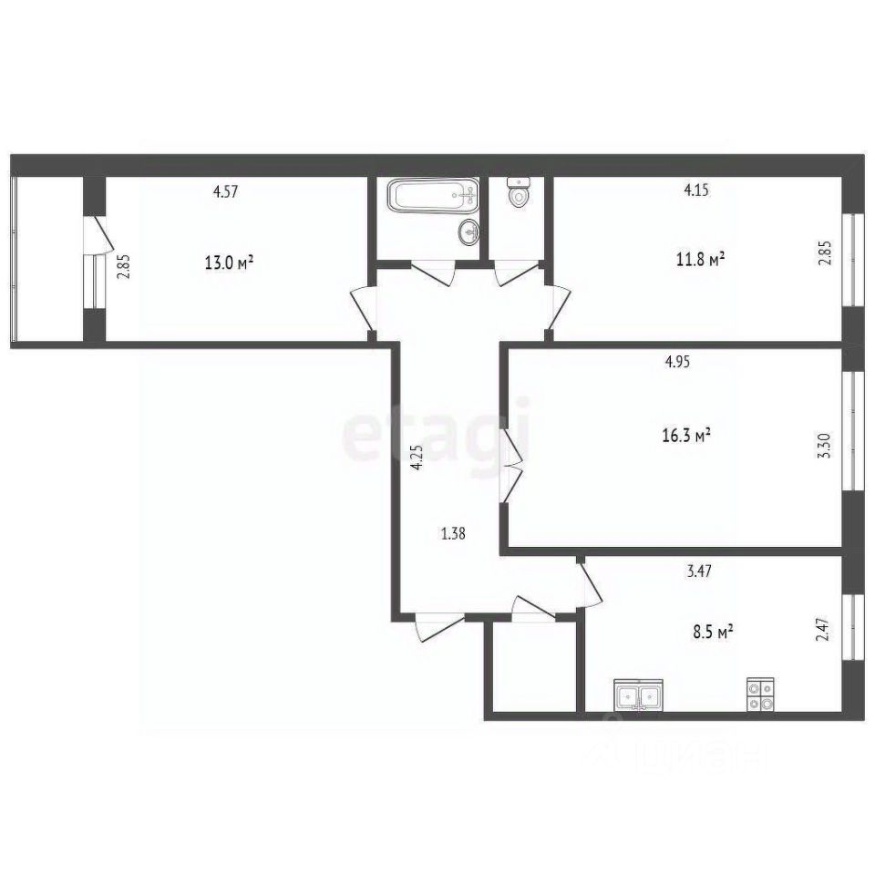 Предлагается к продаже 3-х ком. квартира с удобной планировкой: три изолированных комнаты (13, 16,3 и 11,8кв.м.), кухня 8,6 кв.м, небольшая гардеробная, санузел раздельный, балкон застеклен.