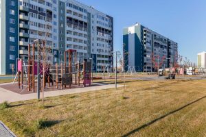 Зеленый ухоженный двор, оборудованный детскими площадками на разный возраст.