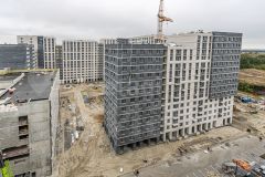 Фасад дома выполнен в современном минималистичном архитектурном стиле из силикатного кирпича с применением ярких акцентов из штукатурного фасада. Фасадные решения подчеркивают современный подход как к жилому дому, так и микрорайону в целом, выделяясь своей стилистикой на фоне окружающей застройки.