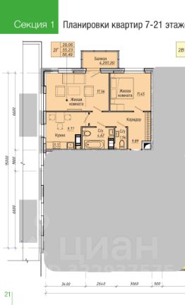 Продается 2х комнатная квартира площадью 57м2 на 21 этаже (отсутствие соседей сверху), высота потолков 2,9м!