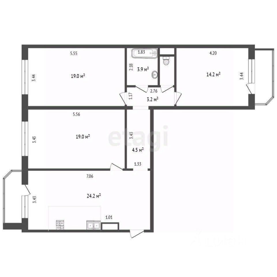 Кухня-гостиная, три изолированные комнаты, с/у раздельный, две лоджии.