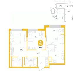 площадь квартиры - 61,2 кв.мГармоничные пропорции и большие окна наполняют пространство светом, создавая уютную атмосферу. Умное зонирование позволяет удобно организовать как рабочую, так и жилую зоны, что особенно важно для современных жителей. Санузел спроектирован с учетом всех потребностей: здесь есть ванна и место для стиральной машины. Каждый метр квартиры используется с максимальной эффективностью, что делает эту планировку отличным выбором для тех, кто ценит комфорт и удобство.