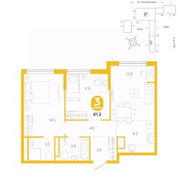 площадь квартиры - 61,2 кв.мГармоничные пропорции и большие окна наполняют пространство светом, создавая уютную атмосферу. Умное зонирование позволяет удобно организовать как рабочую, так и жилую зоны, что особенно важно для современных жителей. Санузел спроектирован с учетом всех потребностей: здесь есть ванна и место для стиральной машины. Каждый метр квартиры используется с максимальной эффективностью, что делает эту планировку отличным выбором для тех, кто ценит комфорт и удобство.