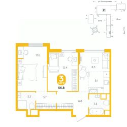 площадь квартиры - 56,8 кв.мГармоничные пропорции и большие окна наполняют пространство светом, создавая уютную атмосферу. Умное зонирование позволяет удобно организовать как рабочую, так и жилую зоны, что особенно важно для современных жителей. Санузел спроектирован с учетом всех потребностей: здесь есть ванна и место для стиральной машины. Каждый метр квартиры используется с максимальной эффективностью, что делает эту планировку отличным выбором для тех, кто ценит комфорт и удобство.