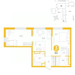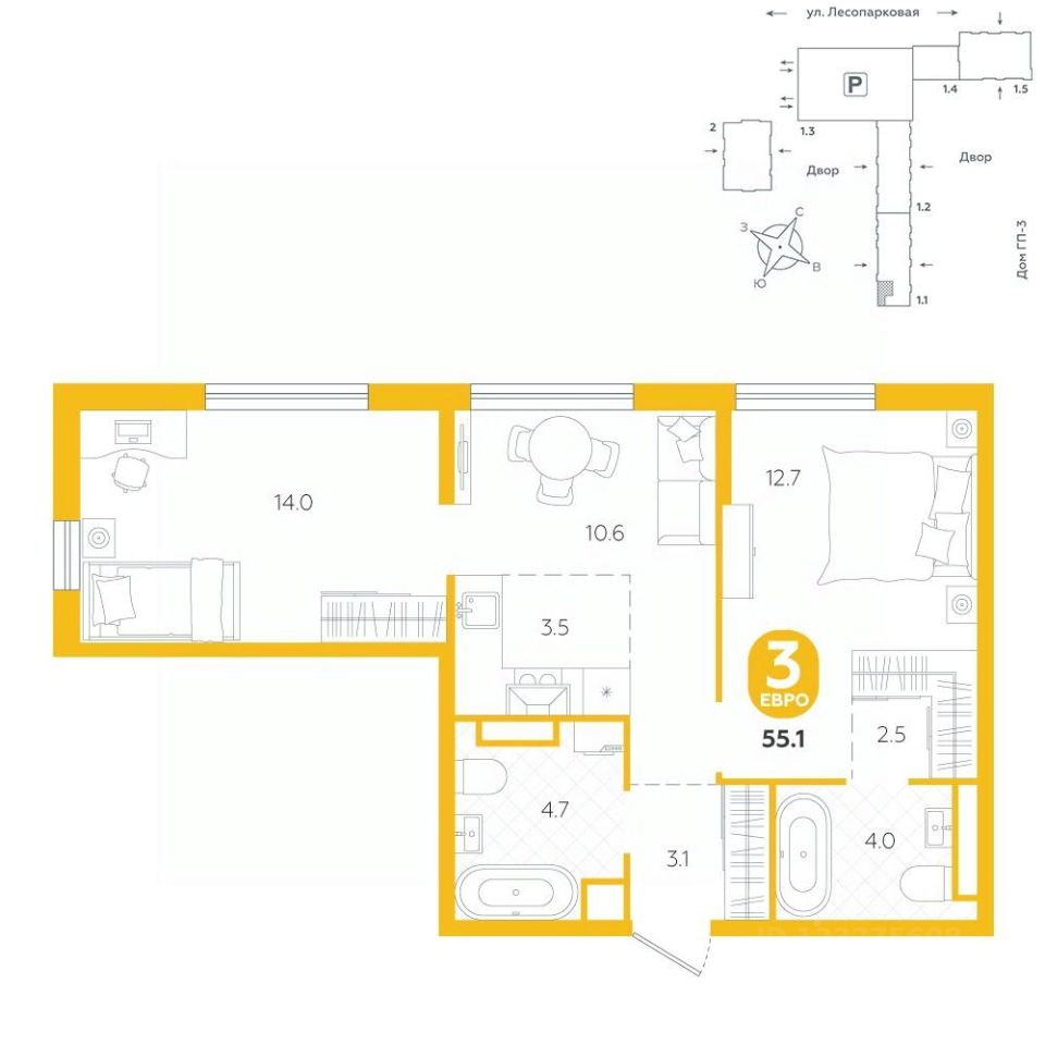 площадь квартиры - 55,1 кв.мГармоничные пропорции и большие окна наполняют пространство светом, создавая уютную атмосферу. Умное зонирование позволяет удобно организовать как рабочую, так и жилую зоны, что особенно важно для современных жителей. Санузел спроектирован с учетом всех потребностей: здесь есть ванна и место для стиральной машины. Каждый метр квартиры используется с максимальной эффективностью, что делает эту планировку отличным выбором для тех, кто ценит комфорт и удобство.