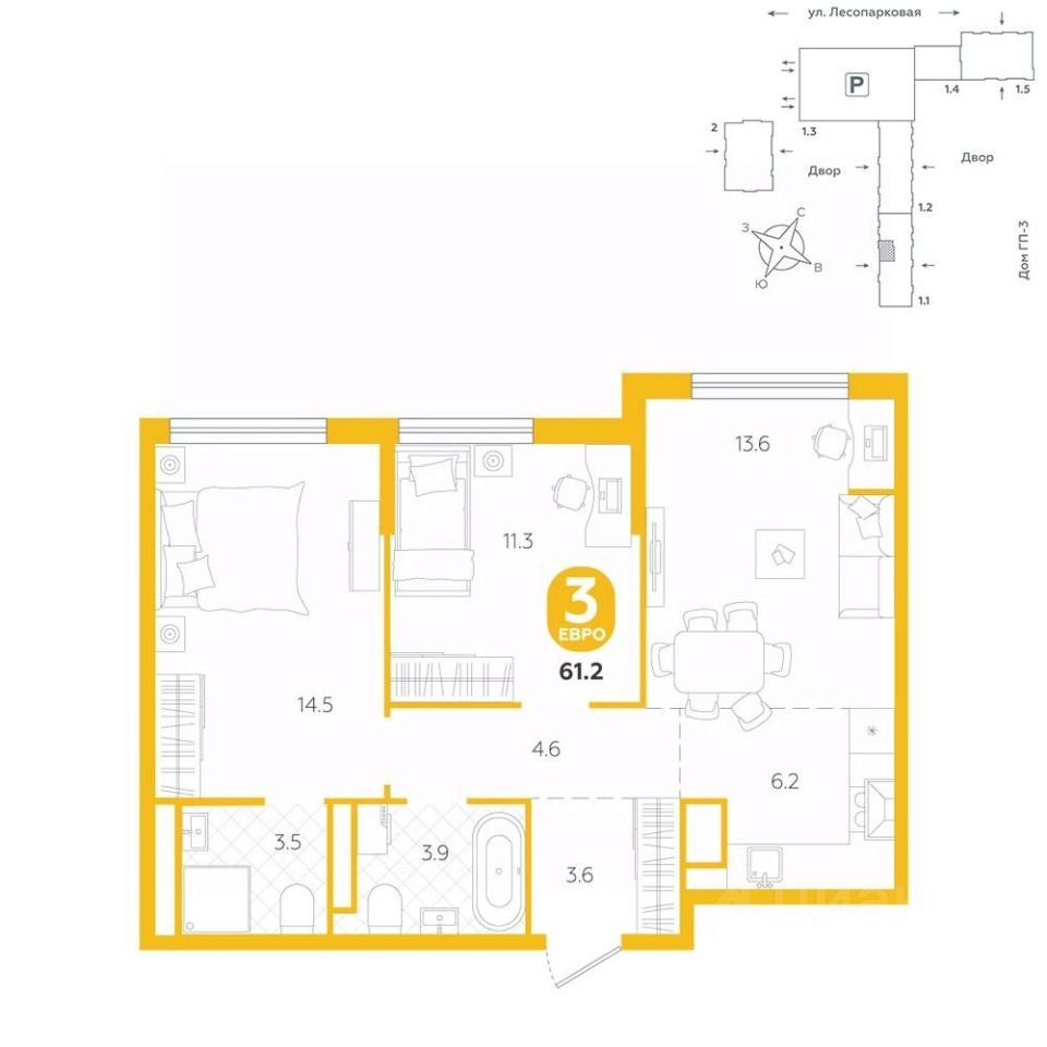 площадь квартиры - 61,2 кв.мГармоничные пропорции и большие окна наполняют пространство светом, создавая уютную атмосферу. Умное зонирование позволяет удобно организовать как рабочую, так и жилую зоны, что особенно важно для современных жителей. Санузел спроектирован с учетом всех потребностей: здесь есть ванна и место для стиральной машины. Каждый метр квартиры используется с максимальной эффективностью, что делает эту планировку отличным выбором для тех, кто ценит комфорт и удобство.