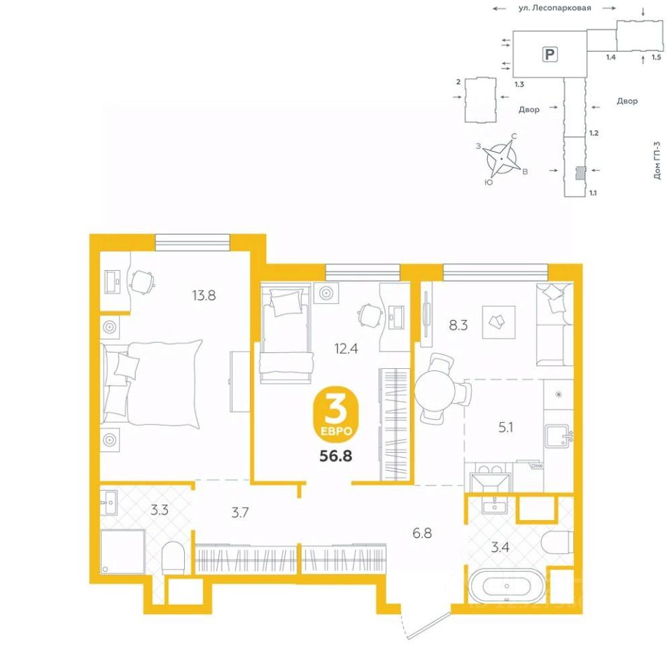 площадь квартиры - 56,8 кв.мГармоничные пропорции и большие окна наполняют пространство светом, создавая уютную атмосферу. Умное зонирование позволяет удобно организовать как рабочую, так и жилую зоны, что особенно важно для современных жителей. Санузел спроектирован с учетом всех потребностей: здесь есть ванна и место для стиральной машины. Каждый метр квартиры используется с максимальной эффективностью, что делает эту планировку отличным выбором для тех, кто ценит комфорт и удобство.