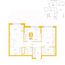 площадь квартиры - 58,2 кв.мГармоничные пропорции и большие окна наполняют пространство светом, создавая уютную атмосферу. Умное зонирование позволяет удобно организовать как рабочую, так и жилую зоны, что особенно важно для современных жителей. Санузел спроектирован с учетом всех потребностей: здесь есть ванна и место для стиральной машины. Каждый метр квартиры используется с максимальной эффективностью, что делает эту планировку отличным выбором для тех, кто ценит комфорт и удобство.