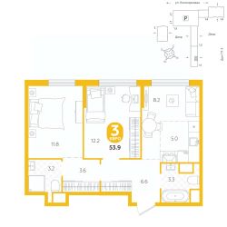 площадь квартиры - 53,9 кв.мГармоничные пропорции и большие окна наполняют пространство светом, создавая уютную атмосферу. Умное зонирование позволяет удобно организовать как рабочую, так и жилую зоны, что особенно важно для современных жителей. Санузел спроектирован с учетом всех потребностей: здесь есть ванна и место для стиральной машины. Каждый метр квартиры используется с максимальной эффективностью, что делает эту планировку отличным выбором для тех, кто ценит комфорт и удобство.