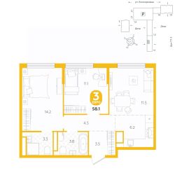 площадь квартиры - 58,1 кв.мГармоничные пропорции и большие окна наполняют пространство светом, создавая уютную атмосферу. Умное зонирование позволяет удобно организовать как рабочую, так и жилую зоны, что особенно важно для современных жителей. Санузел спроектирован с учетом всех потребностей: здесь есть ванна и место для стиральной машины. Каждый метр квартиры используется с максимальной эффективностью, что делает эту планировку отличным выбором для тех, кто ценит комфорт и удобство.