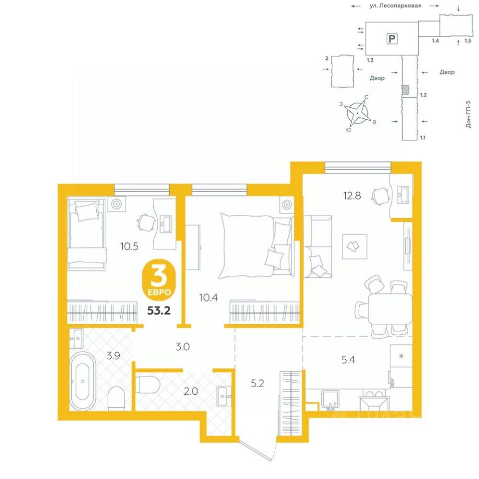 площадь квартиры - 53,2 кв.мГармоничные пропорции и большие окна наполняют пространство светом, создавая уютную атмосферу. Умное зонирование позволяет удобно организовать как рабочую, так и жилую зоны, что особенно важно для современных жителей. Санузел спроектирован с учетом всех потребностей: здесь есть ванна и место для стиральной машины. Каждый метр квартиры используется с максимальной эффективностью, что делает эту планировку отличным выбором для тех, кто ценит комфорт и удобство.