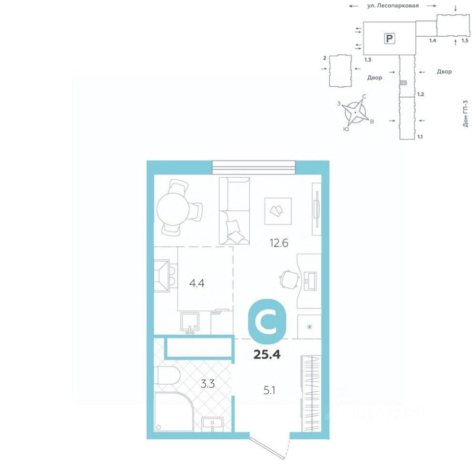 площадь квартиры - 25,4 кв.мГармоничные пропорции и большие окна наполняют пространство светом, создавая уютную атмосферу. Умное зонирование позволяет удобно организовать как рабочую, так и жилую зоны, что особенно важно для современных жителей. Санузел спроектирован с учетом всех потребностей: здесь есть ванна и место для стиральной машины. Каждый метр квартиры используется с максимальной эффективностью, что делает эту планировку отличным выбором для тех, кто ценит комфорт и удобство.
