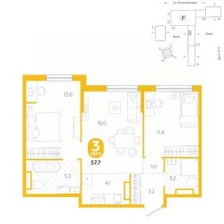 площадь квартиры - 57,7 кв.мГармоничные пропорции и большие окна наполняют пространство светом, создавая уютную атмосферу. Умное зонирование позволяет удобно организовать как рабочую, так и жилую зоны, что особенно важно для современных жителей. Санузел спроектирован с учетом всех потребностей: здесь есть ванна и место для стиральной машины. Каждый метр квартиры используется с максимальной эффективностью, что делает эту планировку отличным выбором для тех, кто ценит комфорт и удобство.