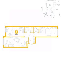 площадь квартиры - 68,7 кв.мГармоничные пропорции и большие окна наполняют пространство светом, создавая уютную атмосферу. Умное зонирование позволяет удобно организовать как рабочую, так и жилую зоны, что особенно важно для современных жителей. Санузел спроектирован с учетом всех потребностей: здесь есть ванна и место для стиральной машины. Каждый метр квартиры используется с максимальной эффективностью, что делает эту планировку отличным выбором для тех, кто ценит комфорт и удобство.