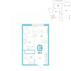 площадь квартиры - 25,4 кв.мГармоничные пропорции и большие окна наполняют пространство светом, создавая уютную атмосферу. Умное зонирование позволяет удобно организовать как рабочую, так и жилую зоны, что особенно важно для современных жителей. Санузел спроектирован с учетом всех потребностей: здесь есть ванна и место для стиральной машины. Каждый метр квартиры используется с максимальной эффективностью, что делает эту планировку отличным выбором для тех, кто ценит комфорт и удобство.