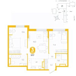 площадь квартиры - 57,7 кв.мГармоничные пропорции и большие окна наполняют пространство светом, создавая уютную атмосферу. Умное зонирование позволяет удобно организовать как рабочую, так и жилую зоны, что особенно важно для современных жителей. Санузел спроектирован с учетом всех потребностей: здесь есть ванна и место для стиральной машины. Каждый метр квартиры используется с максимальной эффективностью, что делает эту планировку отличным выбором для тех, кто ценит комфорт и удобство.