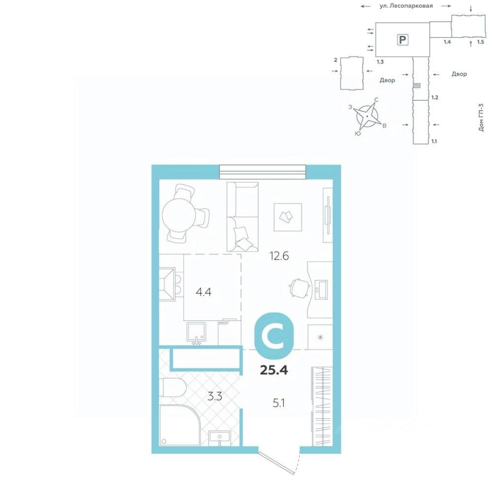 площадь квартиры - 25,4 кв.мГармоничные пропорции и большие окна наполняют пространство светом, создавая уютную атмосферу. Умное зонирование позволяет удобно организовать как рабочую, так и жилую зоны, что особенно важно для современных жителей. Санузел спроектирован с учетом всех потребностей: здесь есть ванна и место для стиральной машины. Каждый метр квартиры используется с максимальной эффективностью, что делает эту планировку отличным выбором для тех, кто ценит комфорт и удобство.