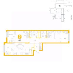 площадь квартиры - 68,7 кв.мГармоничные пропорции и большие окна наполняют пространство светом, создавая уютную атмосферу. Умное зонирование позволяет удобно организовать как рабочую, так и жилую зоны, что особенно важно для современных жителей. Санузел спроектирован с учетом всех потребностей: здесь есть ванна и место для стиральной машины. Каждый метр квартиры используется с максимальной эффективностью, что делает эту планировку отличным выбором для тех, кто ценит комфорт и удобство.