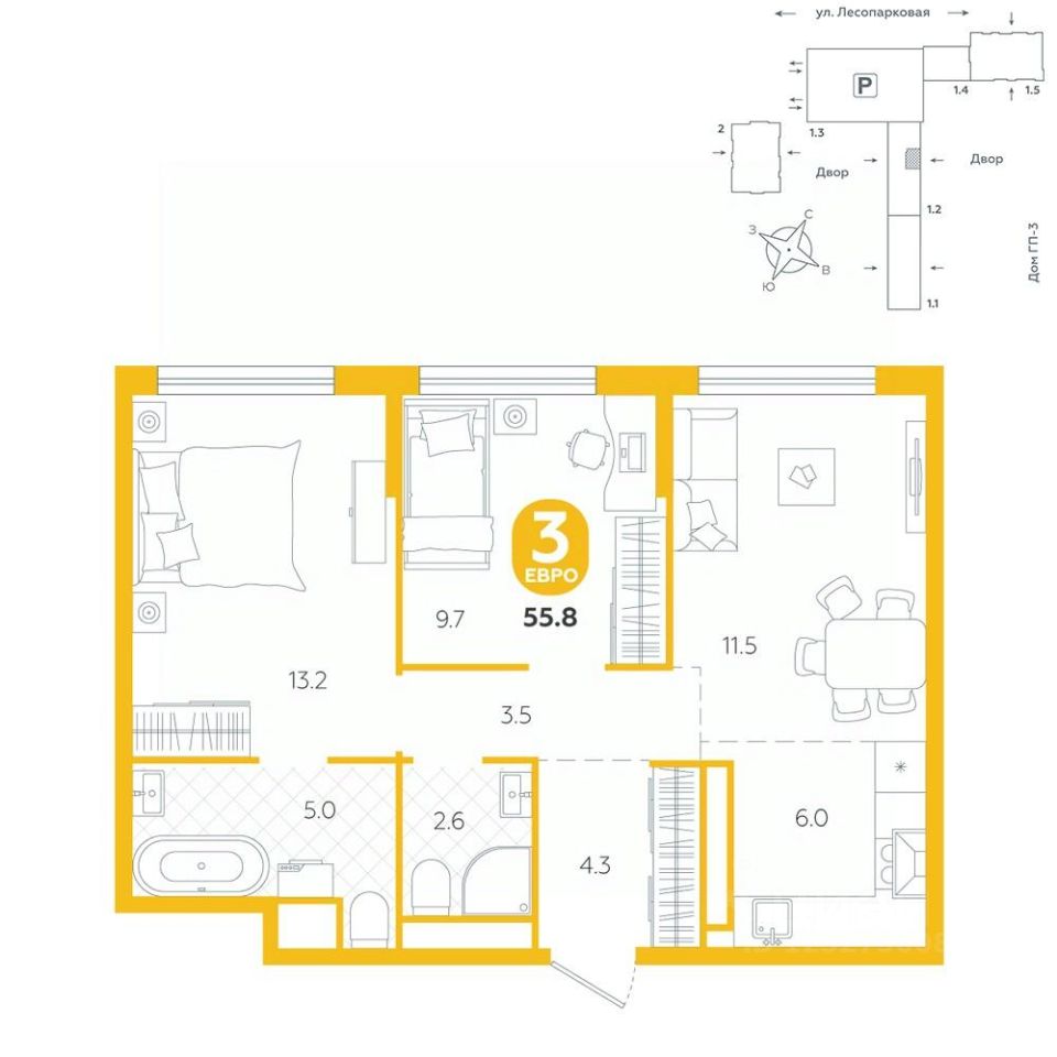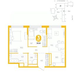 площадь квартиры - 55,8 кв.мГармоничные пропорции и большие окна наполняют пространство светом, создавая уютную атмосферу. Умное зонирование позволяет удобно организовать как рабочую, так и жилую зоны, что особенно важно для современных жителей. Санузел спроектирован с учетом всех потребностей: здесь есть ванна и место для стиральной машины. Каждый метр квартиры используется с максимальной эффективностью, что делает эту планировку отличным выбором для тех, кто ценит комфорт и удобство.