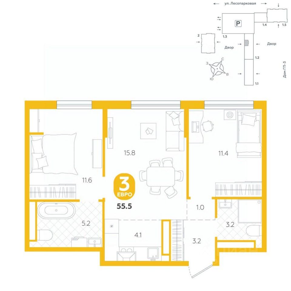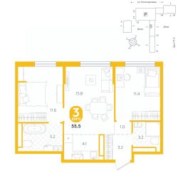 площадь квартиры - 55,5 кв.мГармоничные пропорции и большие окна наполняют пространство светом, создавая уютную атмосферу. Умное зонирование позволяет удобно организовать как рабочую, так и жилую зоны, что особенно важно для современных жителей. Санузел спроектирован с учетом всех потребностей: здесь есть ванна и место для стиральной машины. Каждый метр квартиры используется с максимальной эффективностью, что делает эту планировку отличным выбором для тех, кто ценит комфорт и удобство.