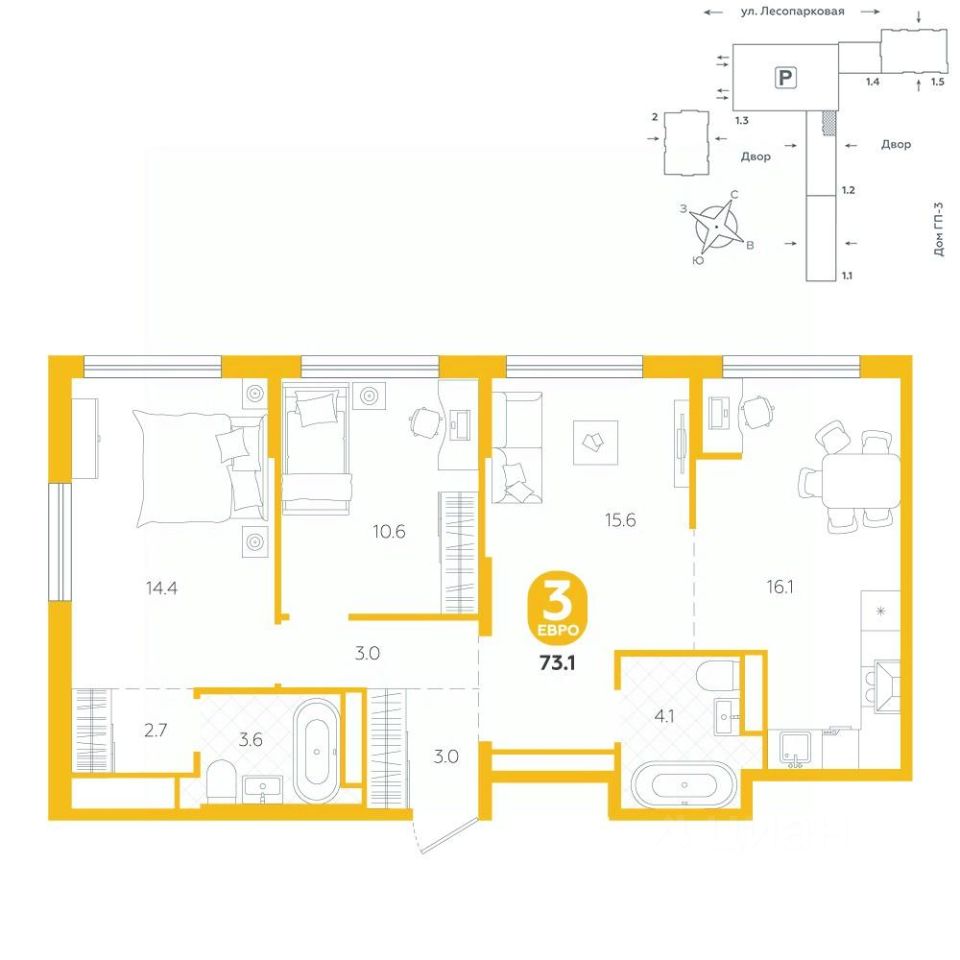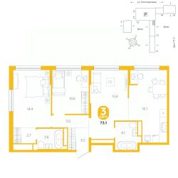 площадь квартиры - 73,1 кв.мГармоничные пропорции и большие окна наполняют пространство светом, создавая уютную атмосферу. Умное зонирование позволяет удобно организовать как рабочую, так и жилую зоны, что особенно важно для современных жителей. Санузел спроектирован с учетом всех потребностей: здесь есть ванна и место для стиральной машины. Каждый метр квартиры используется с максимальной эффективностью, что делает эту планировку отличным выбором для тех, кто ценит комфорт и удобство.