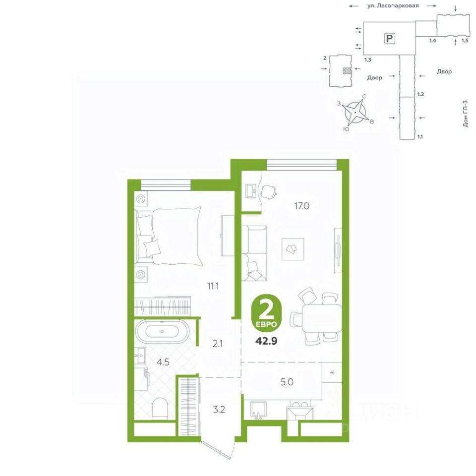 площадь квартиры - 42,9 кв.м
