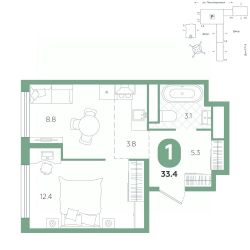Гармоничные пропорции и большие окна наполняют пространство светом, создавая уютную атмосферу. Умное зонирование позволяет удобно организовать как рабочую, так и жилую зоны, что особенно важно для современных жителей. Санузел спроектирован с учетом всех потребностей: здесь есть ванна и место для стиральной машины. Каждый метр квартиры используется с максимальной эффективностью, что делает эту планировку отличным выбором для тех, кто ценит комфорт и удобство.