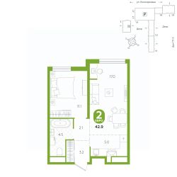 площадь квартиры - 42,9 кв.м