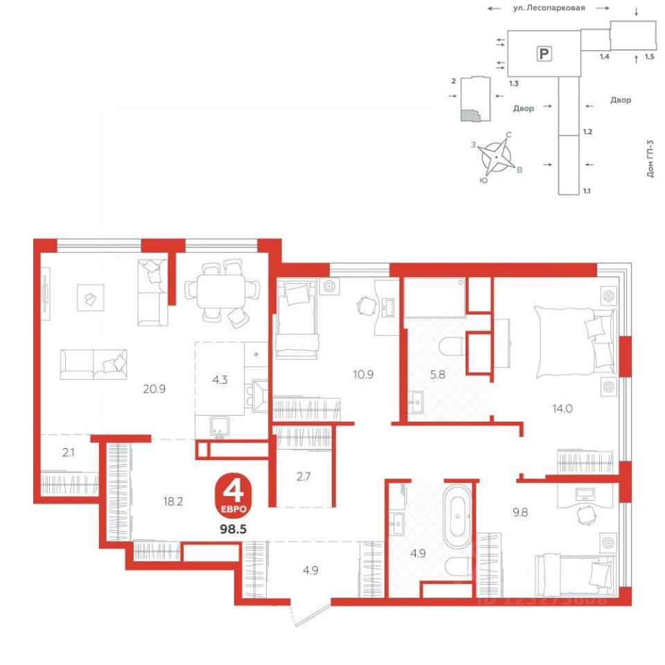 площадь квартиры - 98,5 кв.м