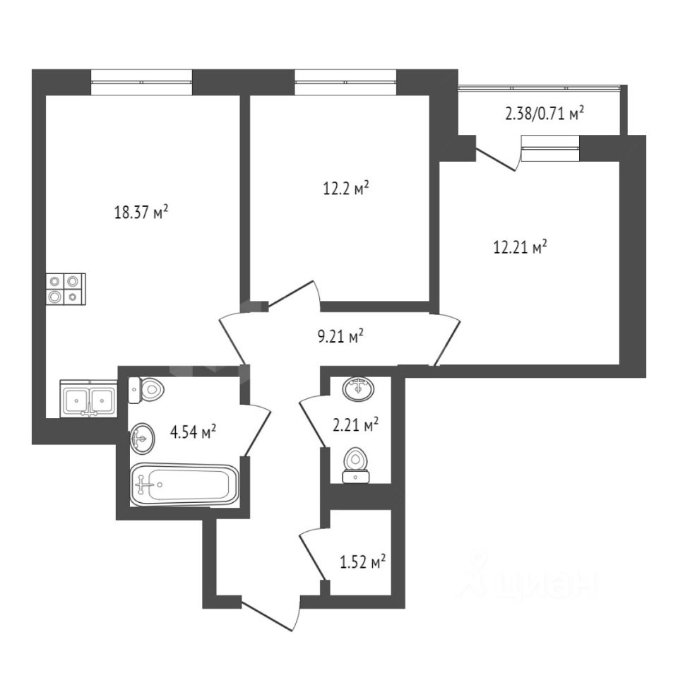 - Удачная планировка с просторной кухней-гостиной, 2 отдельными спальнями, 2 кладовками и лоджией