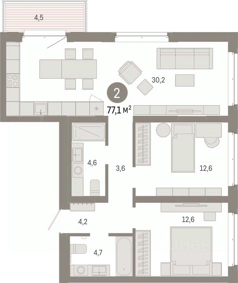 2-комн. квартира с предчистовой отделкой в Кварталы "На Минской" на 5 этаже. Общая площадь: 77.05 кв.м., жилая: 25.2 кв.м., площадь просторной кухни-гостиной: 30.2 кв.м. Квартира угловая, идеально подойдет любителям тишины и панорамных видов. В квартире один балкон, два совмещенных санузла. Высота потолков 2.7 м.