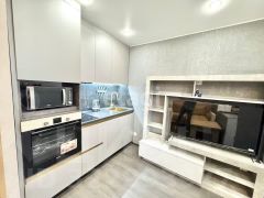 Предлагается квартира-студия площадью 24,3 м² на 10-м этаже нового жилого комплекса с качественным современным ремонтом и продуманной инженерной инфраструктурой. Объект никогда не использовался для проживания — все работы выполнены с нуля с применением надежных материалов и технологий. Электрическая разводка выполнена кабелем увеличенного сечения с 24 розетками и 12 автоматами в щитке, счетчик вынесен в коридор. В санузле и на лоджии установлены теплые полы, разведены розетки RJ-45 для локальной сети и телевидения. Квартира оснащена системой "Умный дом" с датчиками движения и открытия дверей, круглосуточным онлайн-видеонаблюдением с уведомлениями на телефон и резервным блоком питания. Встроенная техника включает стиральную машину, холодильник с морозильной камерой, духовой шкаф, варочную панель, вытяжку с низким уровнем шума, микроволновую печь и мультимедийный телевизор. Санузел оборудован душевой кабиной с функцией массажа, полотенцесушителем и мощной вентиляцией.