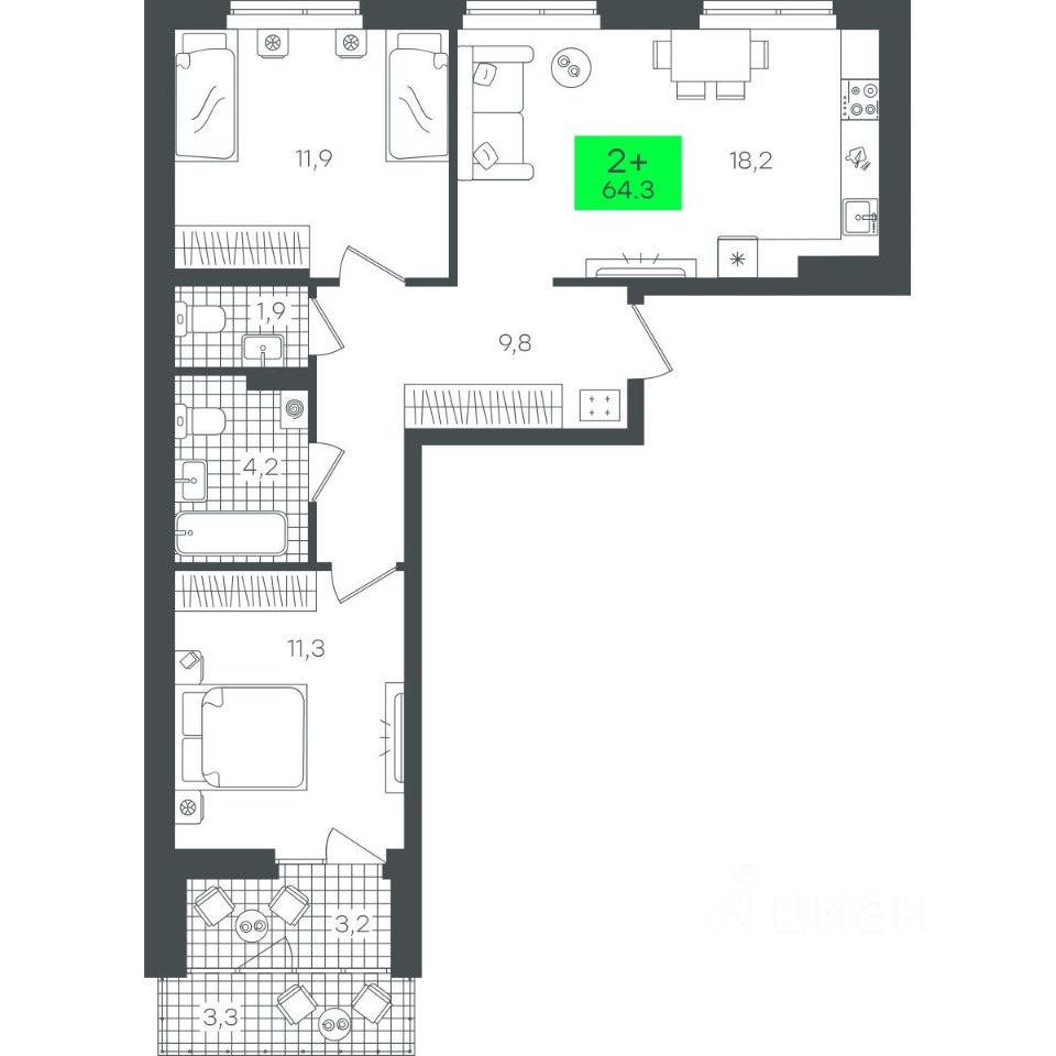 Продаётся 2-комнатная квартира в строящемся доме (3-В7.3 (Малкова, 17)), срок сдачи: III-кв. 2026, общей площадью 64.3 кв.м., на 5 этаже. Компания 4D приступила к строительству нового жилого комплекса "Гранд квартал". Новый ЖК находится в зеленой зоне Калининского района, южнее микрорайона Тюменская слобода.
