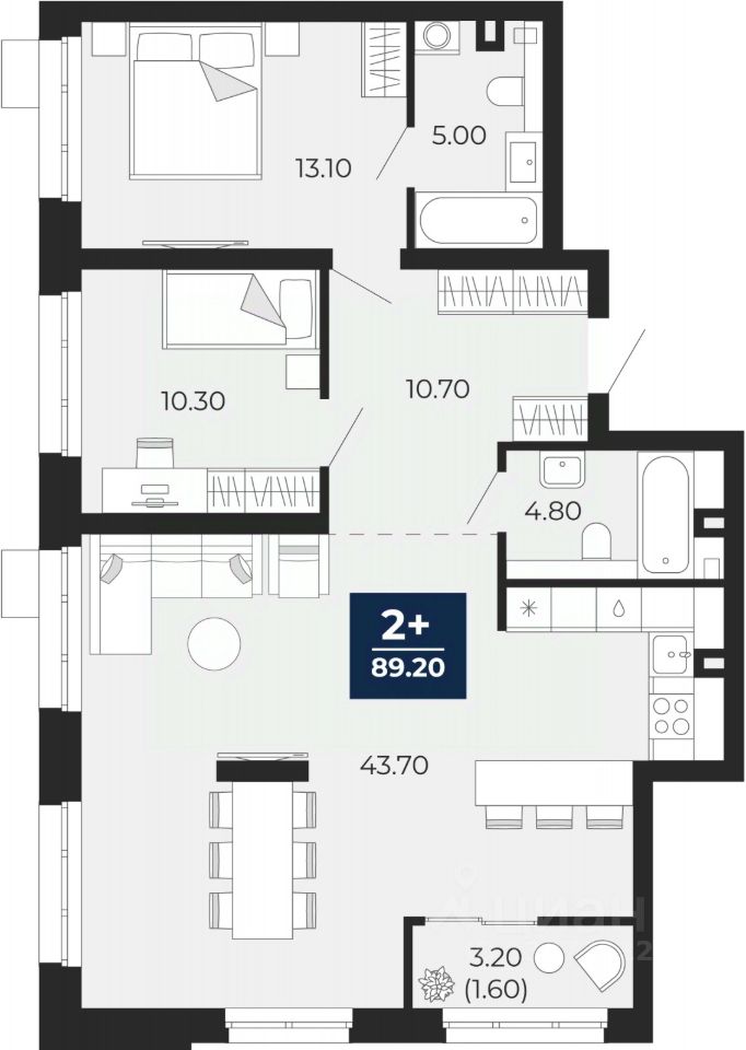 Двухкомнатная квартира от застройщика с предчистовой отделкой в ЖК "Айвазовский City" на 2 этаже. Общая площадь: 89.2 кв.м., жилая: 23.4 кв.м., площадь просторной кухни-столовой: 43.7 кв.м. Квартира угловая, окна oбecпeчивaют paвнoмepнoe ocвeщeниe в тeчeниe дня. В квартире одна лоджия, два совмещенных санузла. Высота потолков 2.72 м.