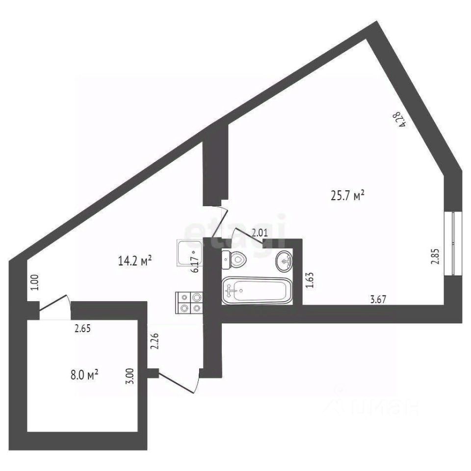 Планировка квартиры — кухня 14 кв.метров, большая жилая комната 26 кв.метров и маленькая спальня-кабинет 8 кв.метров. Санузел совмещенный.