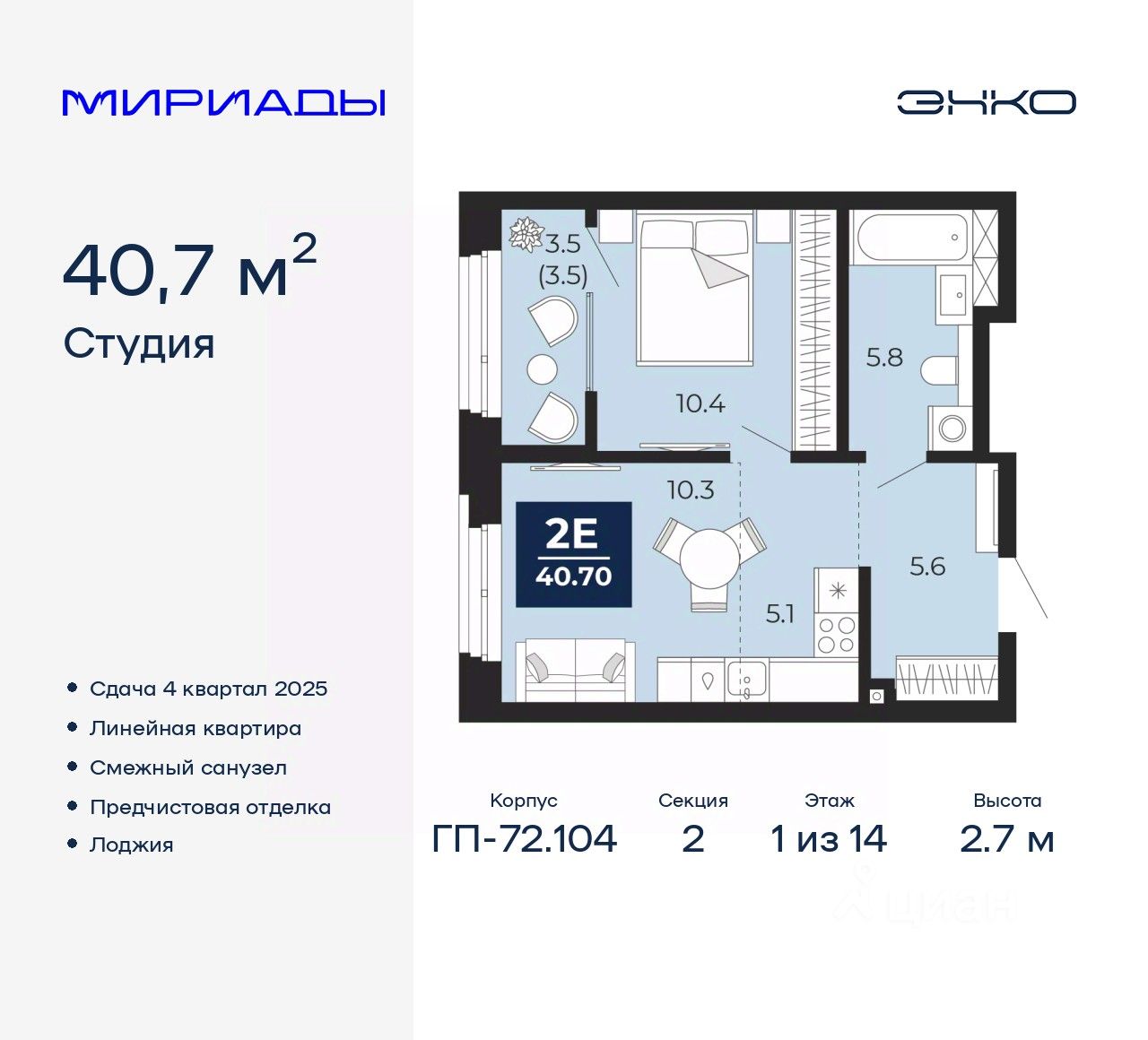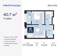 Просторная двухкомнатная квартира с европланировкой и предчистовой отделкой в ЖК "Мириады" на 1 этаже. Общая площадь: 40.7 кв.м., жилая: 20.7 кв.м., общая площадь гостиной-столовой с кухонной зоной: 15.4 кв.м. Европланировка, кухня и гостиная объединены в одно просторное помещение. Комнаты изолированные, все окна выходят на одну сторону. В квартире одна лоджия, один совмещенный санузел. Высота потолков 2.7 м.