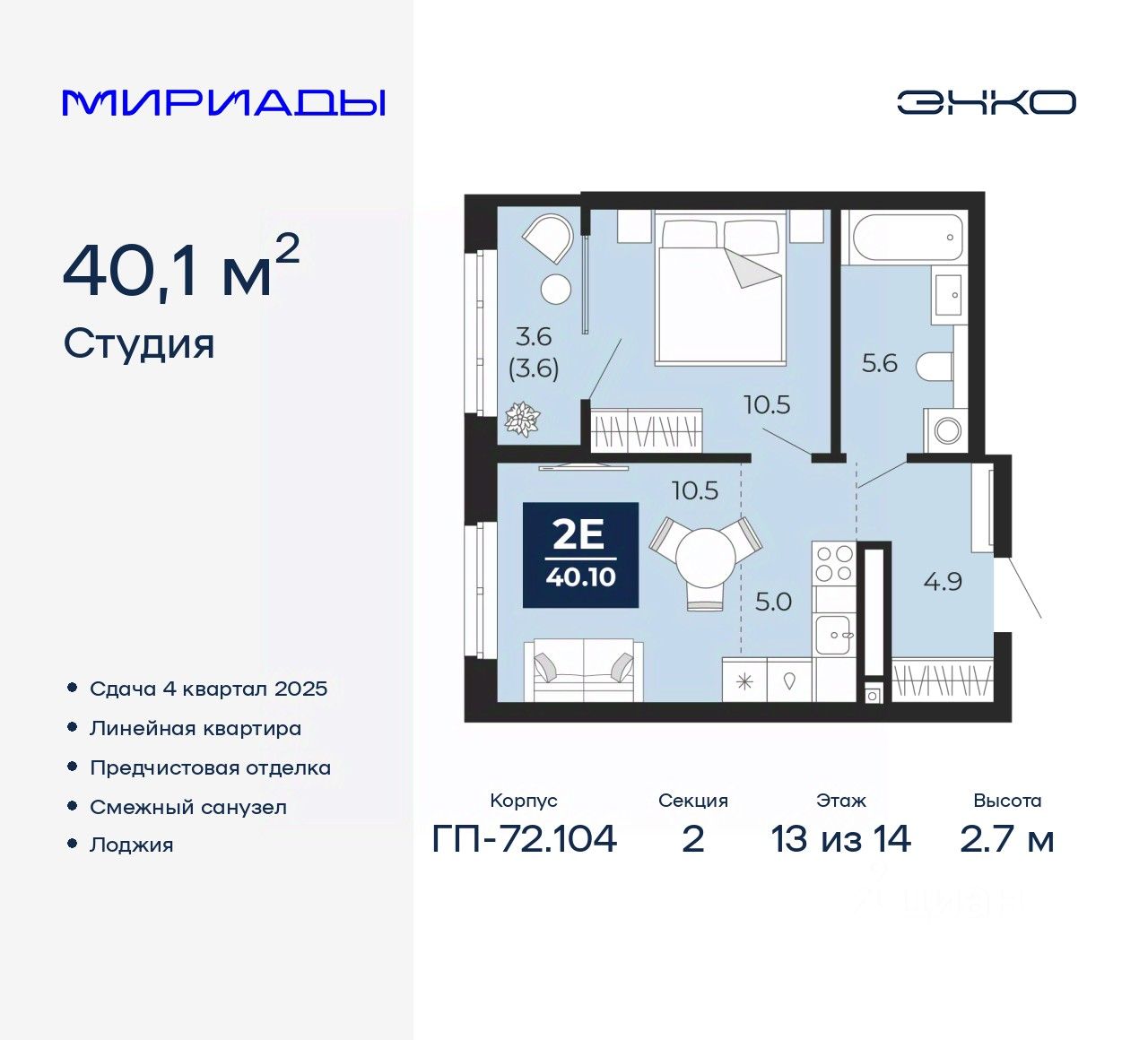 Просторная 2-комн. квартира с европланировкой и предчистовой отделкой в ЖК "Мириады" на 13 этаже. Общая площадь: 40.1 кв.м., жилая: 21 кв.м., общая площадь гостиной-столовой с кухонной зоной: 15.5 кв.м. Европланировка, в просторной кухне-гостиной удобно как готовить, так и отдыхать. Комнаты изолированные, все окна выходят на одну сторону. В квартире одна лоджия, один совмещенный санузел. Высота потолков 2.7 м.